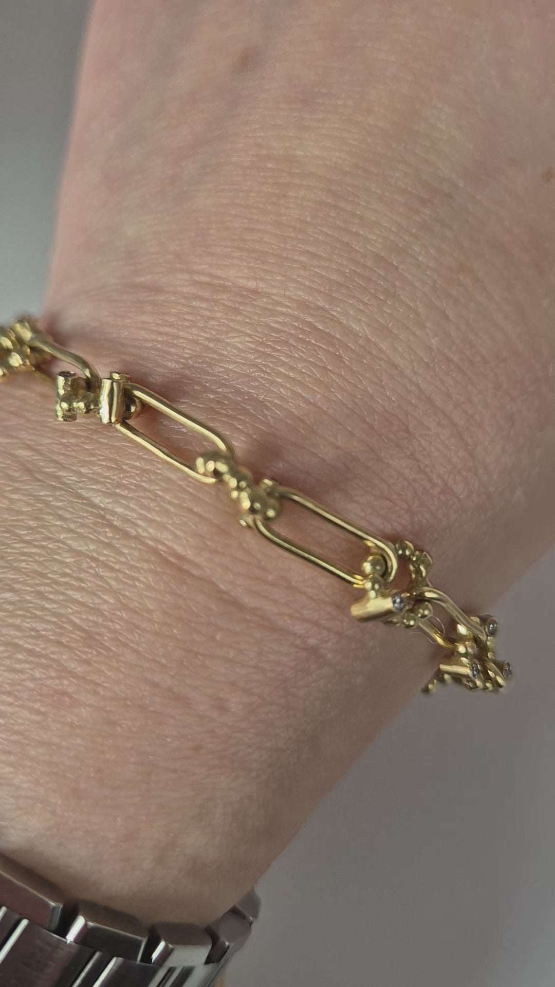 This design began when a customer fell in love with my orbit and paperclip bracelet and asked for one with diamonds set into it. A unique take on the classic tennis bracelet, diamonds are scattered through the orbit links on both sides, catching the light with every turn. The paperclip chain adds a sleek rhythm and movement, while the diamonds sparkle in motion.