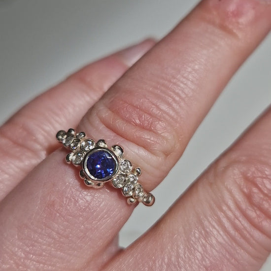 The deep blue of this 5mm tanzanite stone is complemented by sparkling diamonds, creating a timeless and elegant piece.